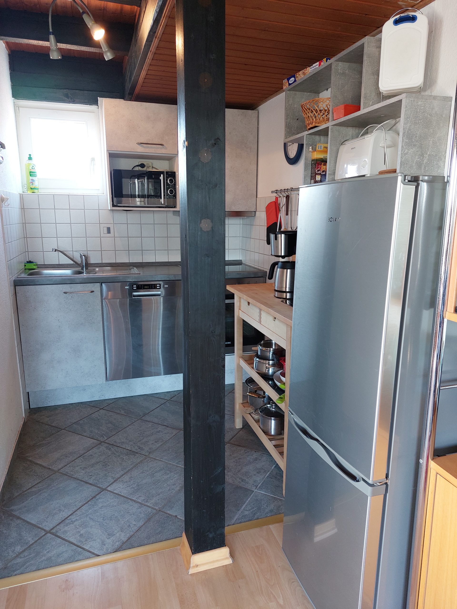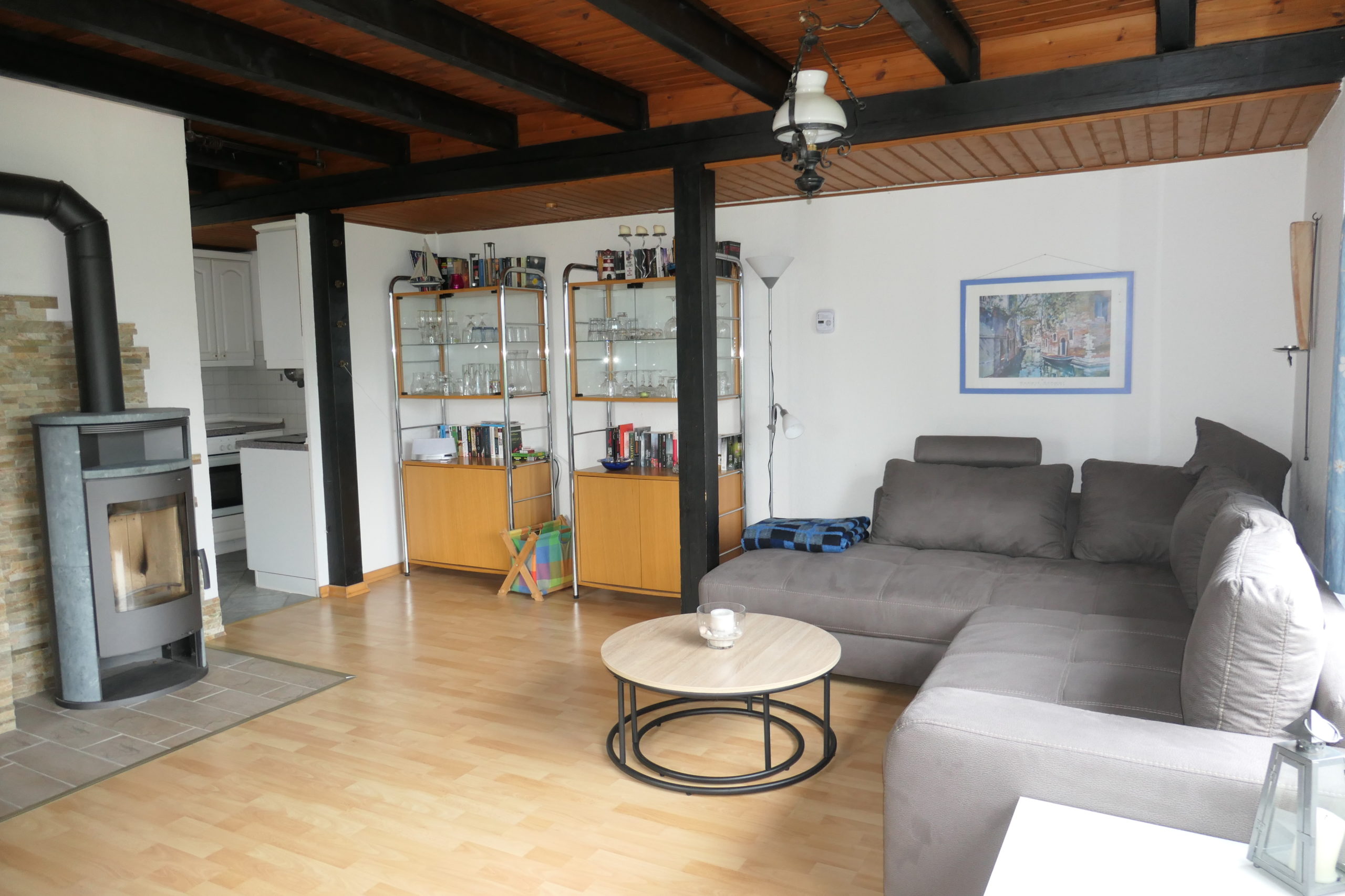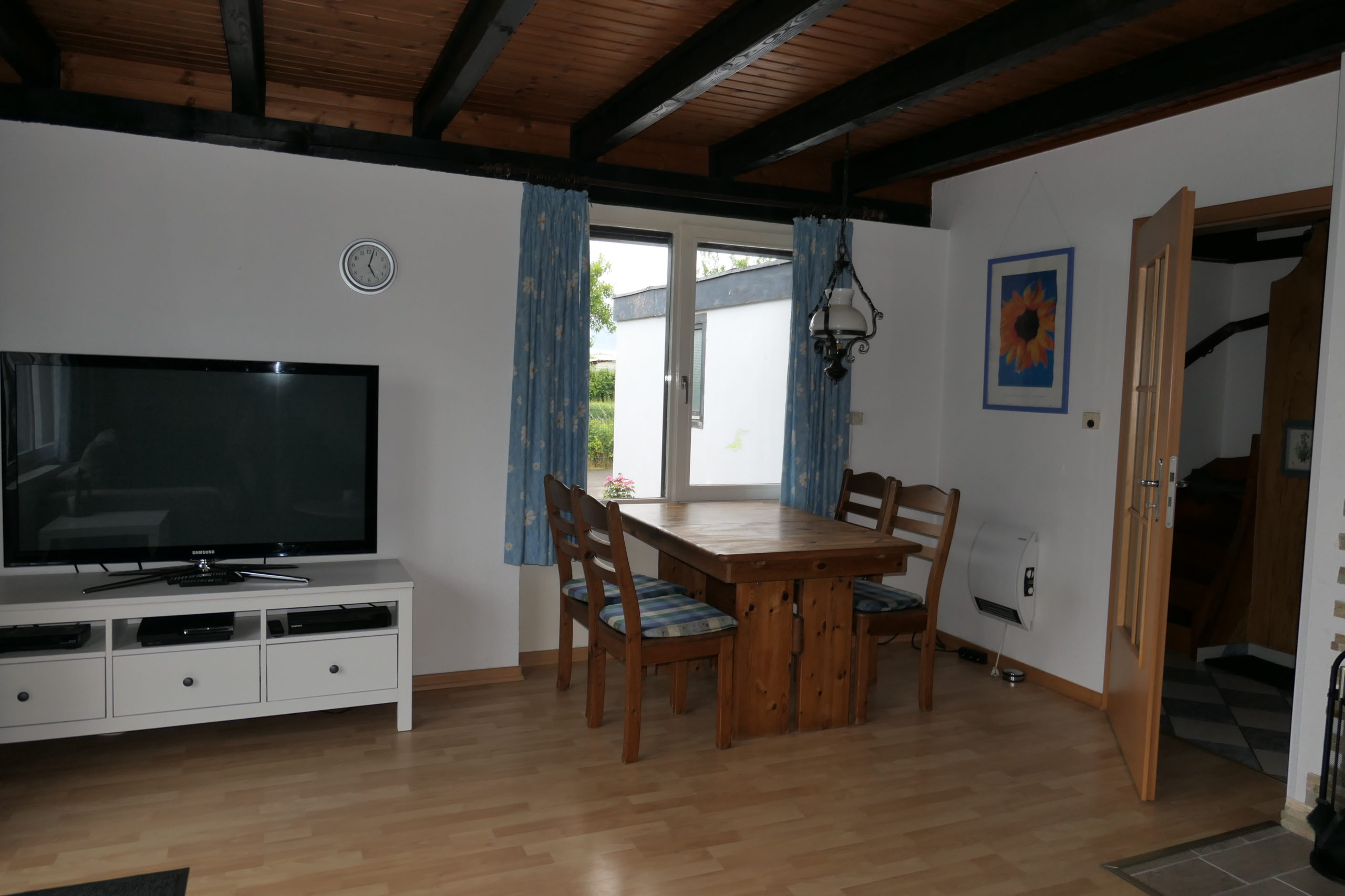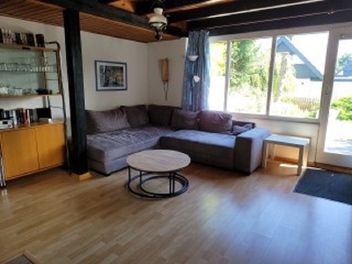 Im Erdgeschoss befindet sich das geräumige Wohnzimmer mit Sitzgruppe (Schlafmöglichkeit für 1-2 Person), großem Flachbildschirm-TV und WLAN, Essplatz und Kaminofen, daran anschließend die neue, kleine Küche mit Backofen, Geschirrspüler. Großer Kombi-Kühlschrank. Große Fensterfront mit Zugang zur Terrasse mit Garten. Kleiner Korridor mit Garderobe. Duschbad mit WC, Waschbecken und Waschmaschine. Kleiner Abstellraum unter der Treppe zum Obergeschoss.