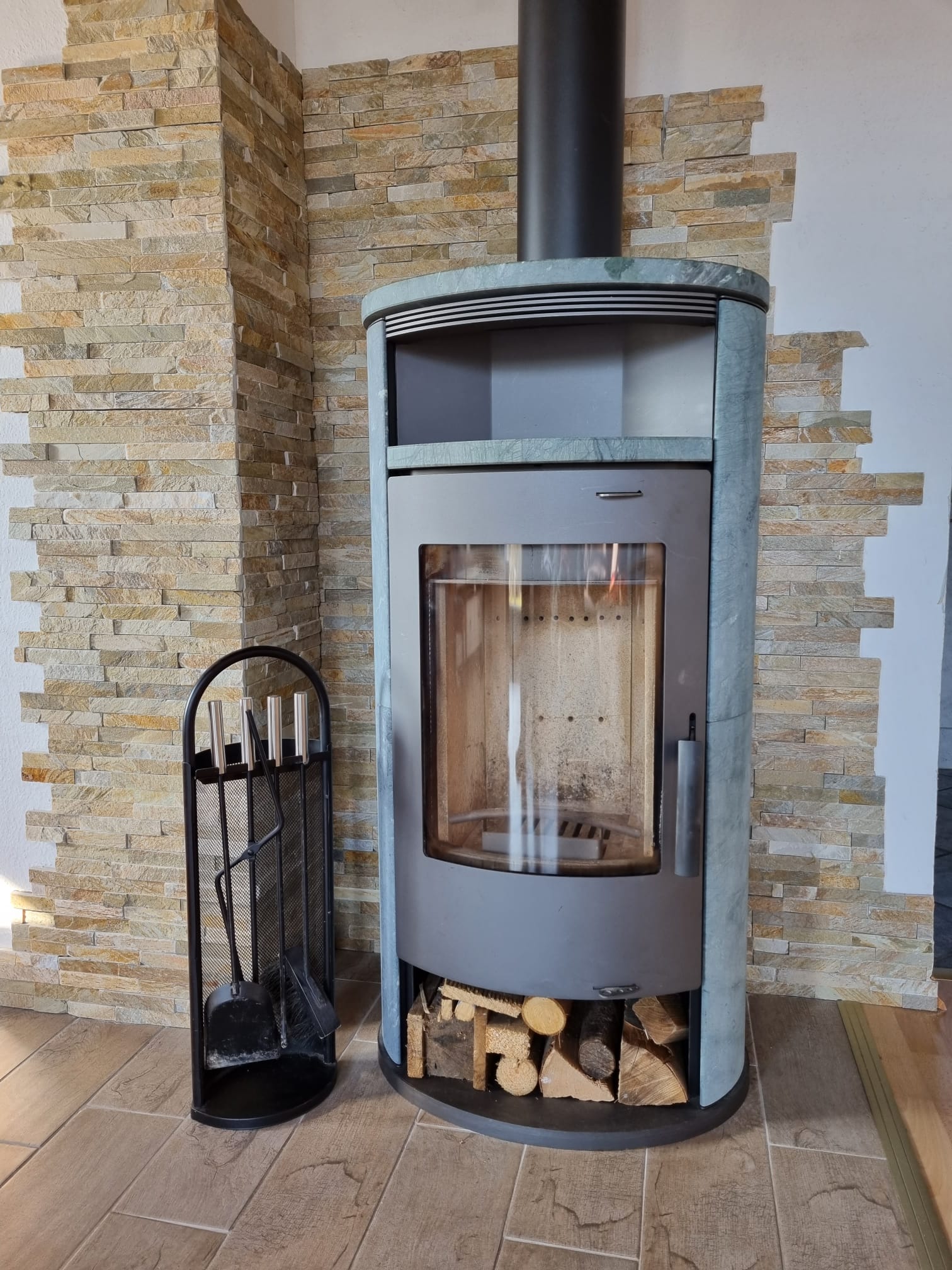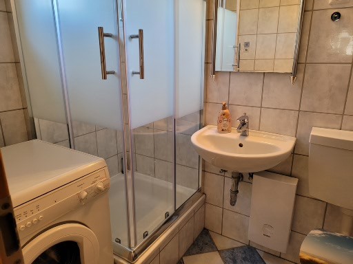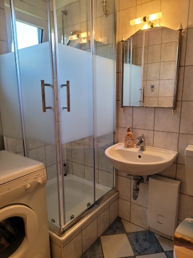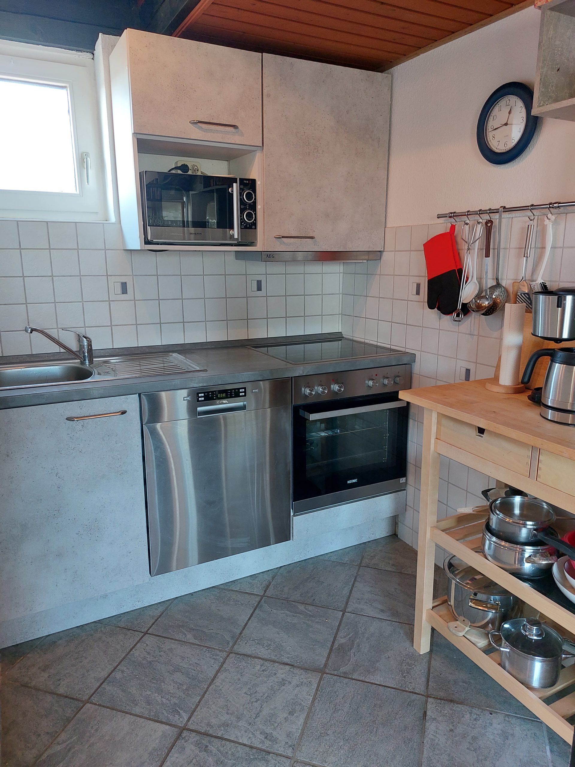 Im Erdgeschoss befindet sich das geräumige Wohnzimmer mit Sitzgruppe (Schlafmöglichkeit für 1-2 Person), großem Flachbildschirm-TV und WLAN, Essplatz und Kaminofen, daran anschließend die neue, kleine Küche mit Backofen, Geschirrspüler. Großer Kombi-Kühlschrank. Große Fensterfront mit Zugang zur Terrasse mit Garten. Kleiner Korridor mit Garderobe. Duschbad mit WC, Waschbecken und Waschmaschine. Kleiner Abstellraum unter der Treppe zum Obergeschoss.