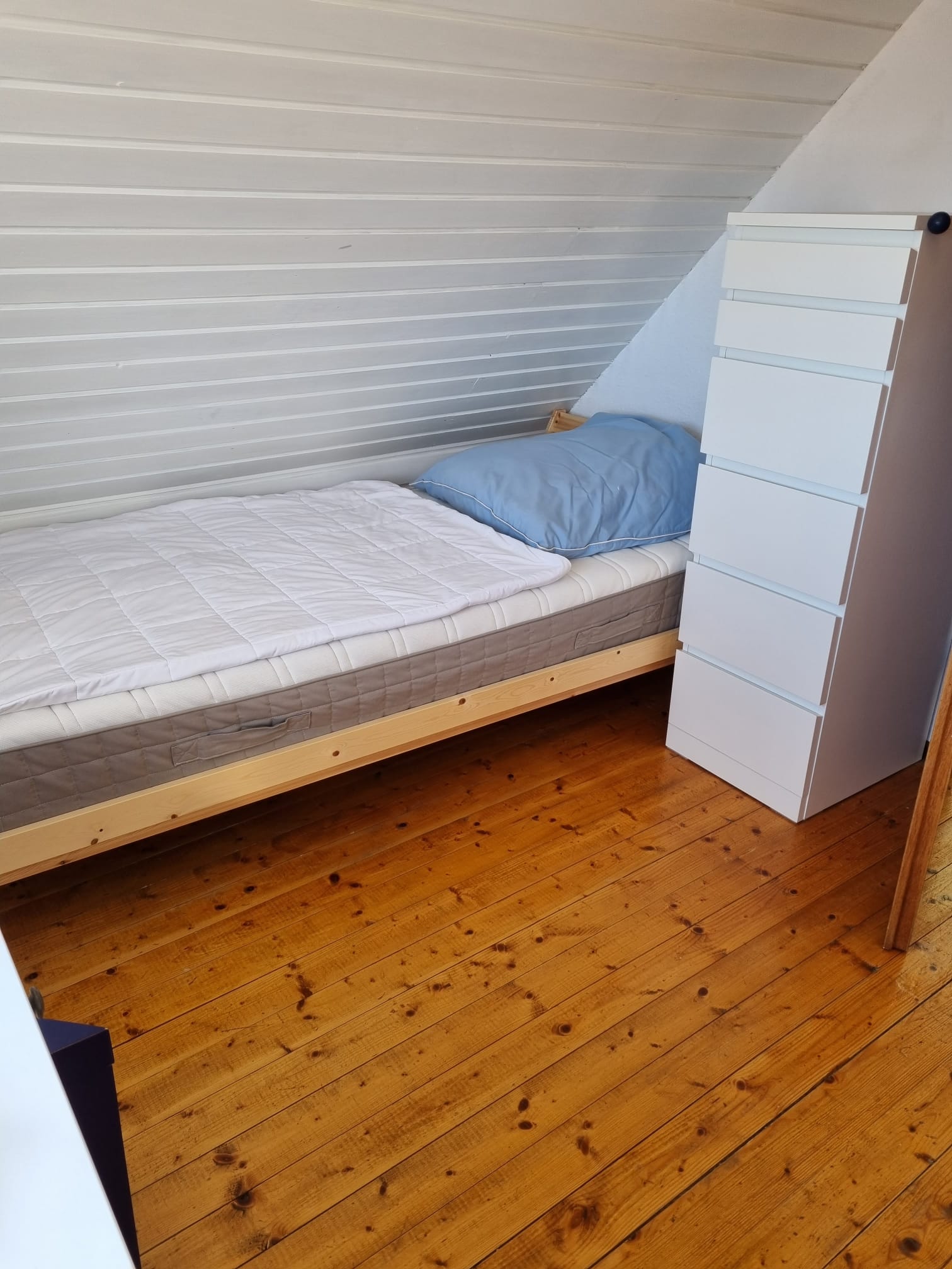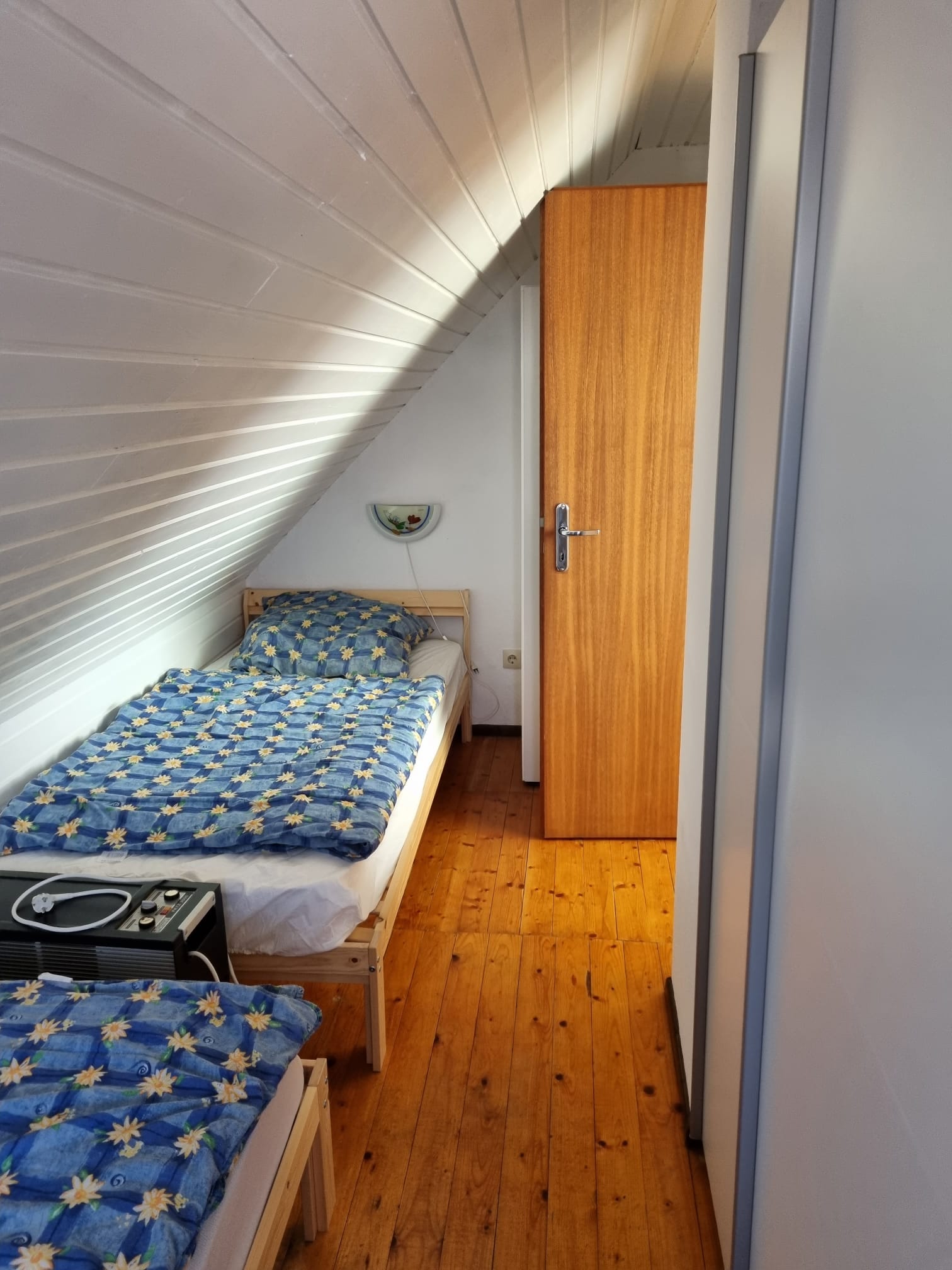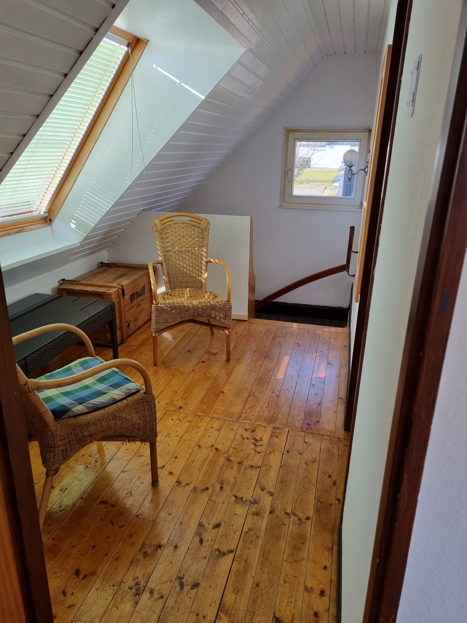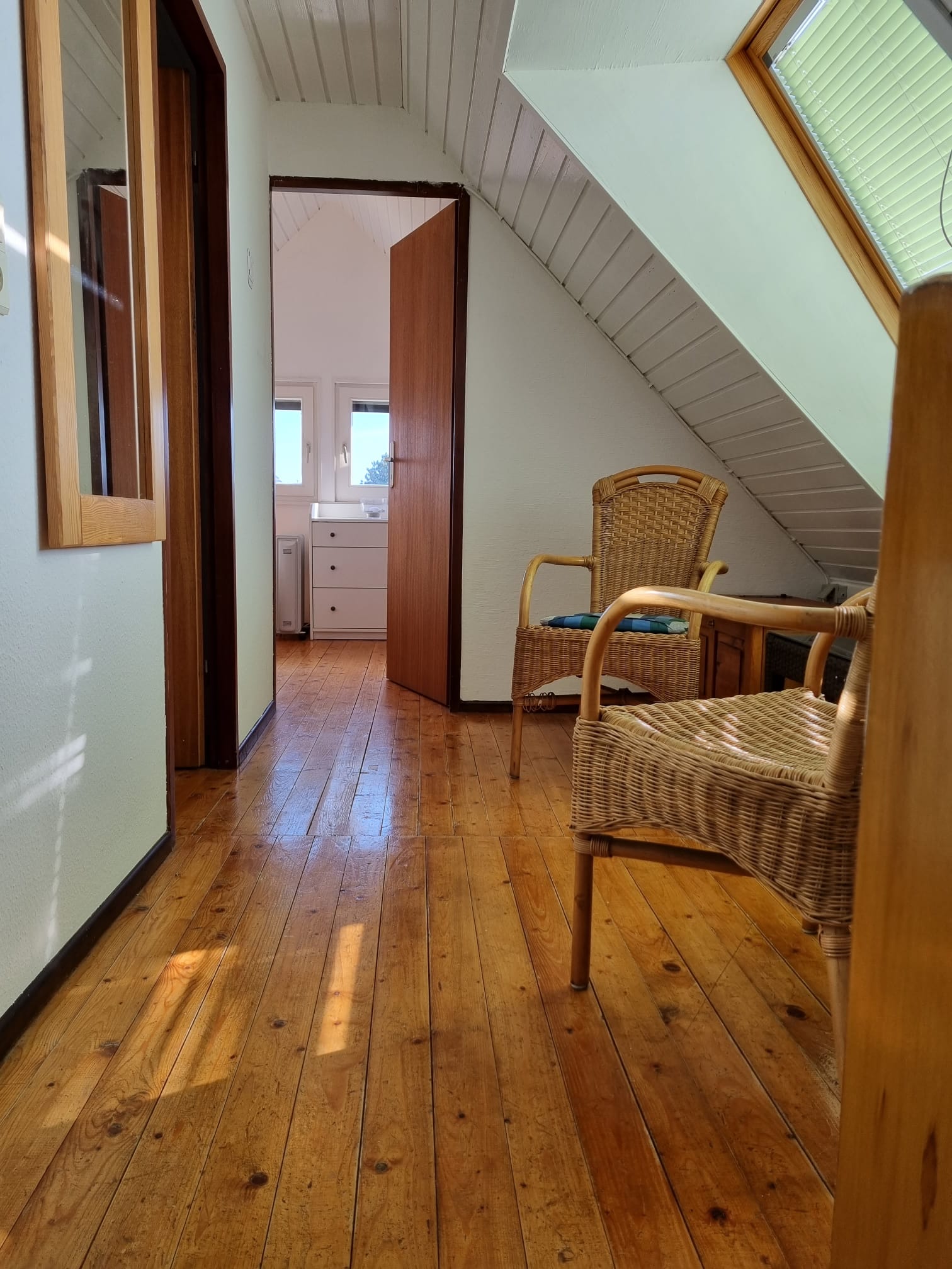 Im Obergeschoss befindet sich ein Schlafzimmer mit 1 Doppelbett und 1 Einzelbett, ein zweites Schlafzimmer mit 2 Einzelbetten, 1 Vorraum, 2 Hochstühle